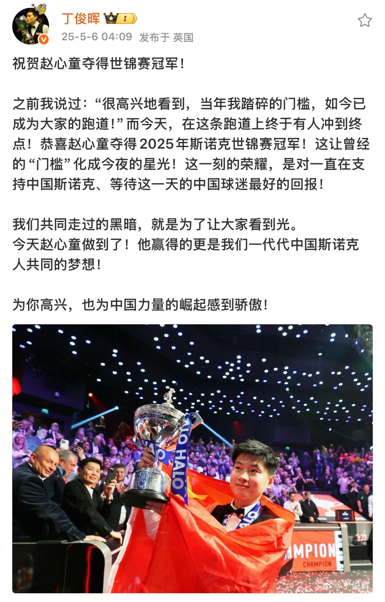 2025年5月6日,在赵心童夺得斯诺克世锦赛冠军时,丁俊晖第一时间在社交媒体上发文祝贺。他写道:“当年我踏碎的门槛,如今已成为大家的跑道!在这条跑道上终于有人冲到终点!赵心童做到了!他赢得的更是我们一代代中国斯诺克人共同的梦想!”
