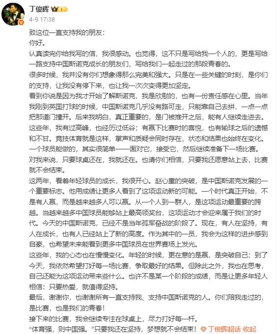 正如丁俊晖在世锦赛前回复球迷的信件中所写下的文字: