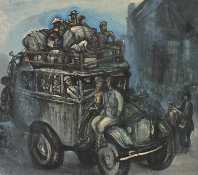 “怒吼吧中国”单元展出的符罗飞画作《溃退》,20世纪40年代,广州艺术博物院藏。主办方供图